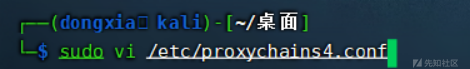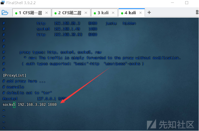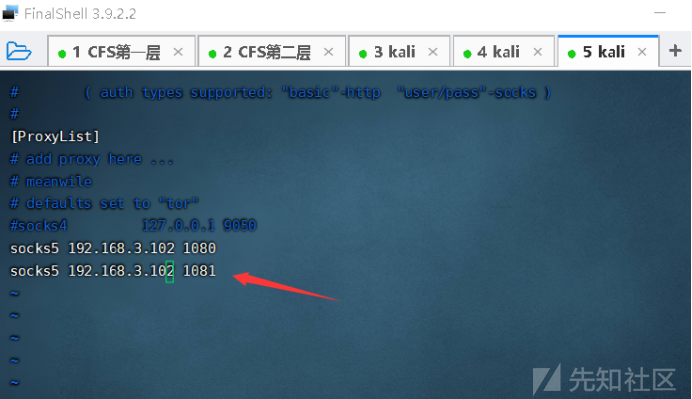 11.由于我们要利用kali上面的工具,所以这里就要设置kali的代理,配置kali的proxychains4.conf,然后在最底下添加msf开启的socks5 和ip端口