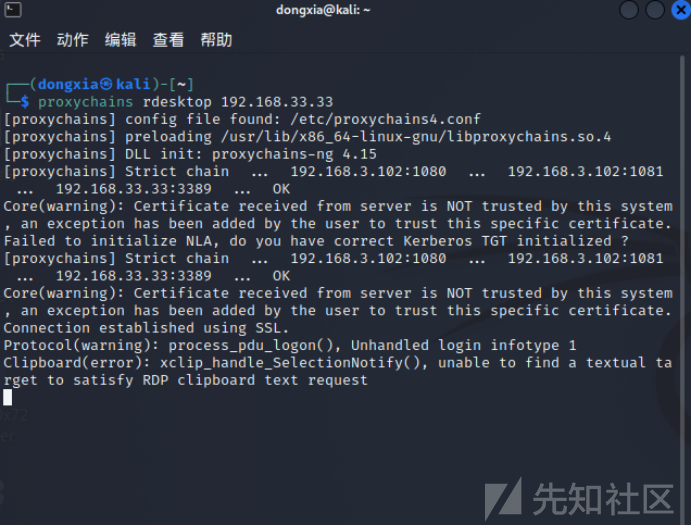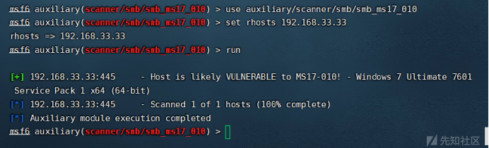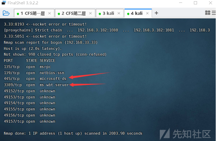 proxychains nmap -Pn -sT -T4192.168.33.33 kali上扫描2.最后有445和3389端口,这明显就是win7的机子,大胆一点猜猜是否有永恒之蓝漏洞