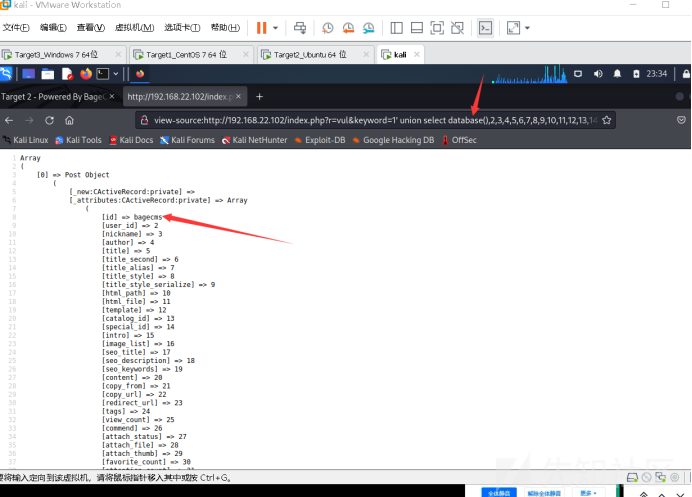 %23是#的url编码过来的6.3 在利用Union select联合注入来找数据库,数据库名叫bagecms