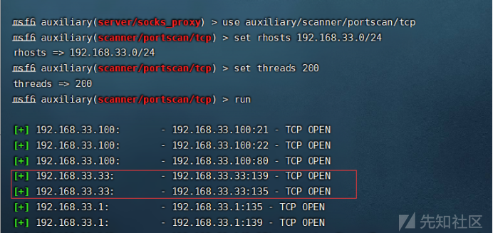 use auxiliary/scanner/portscan/tcp set rhosts 192.168.33.0/24 set threads 200 run渗透target3主机: