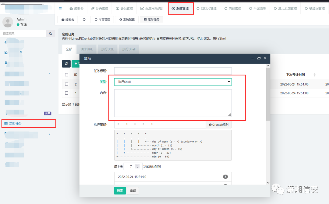 接着翻后台,发现有定时任务功能,尝试反弹shell,写入反弹shell的语句后,在服务器上nc监听等待回连,但是发现并没有执行。