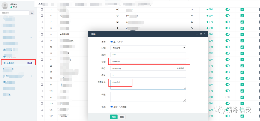 继续翻后台,发现在菜单规则中可以创建规则条件,尝试在功能点中写入phpinfo()。