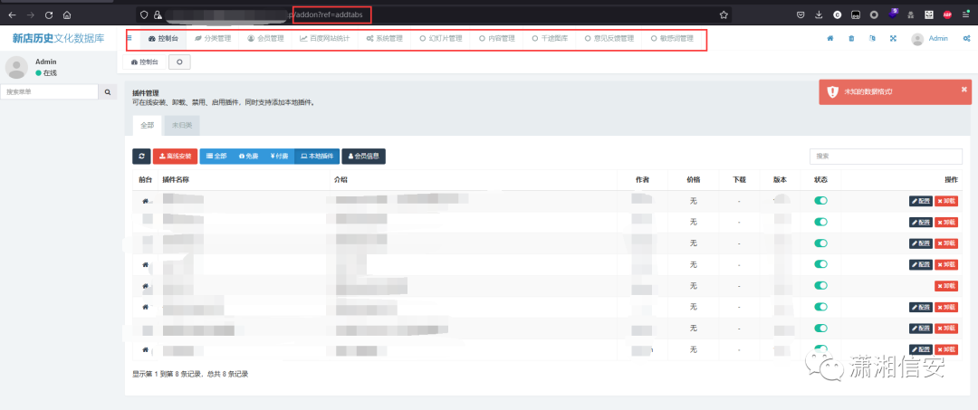 进入后台找功能点getshell。后台默认会有插件管理功能,但是我们在后台没有找到这个功能,我们直接访问插件管理的地址