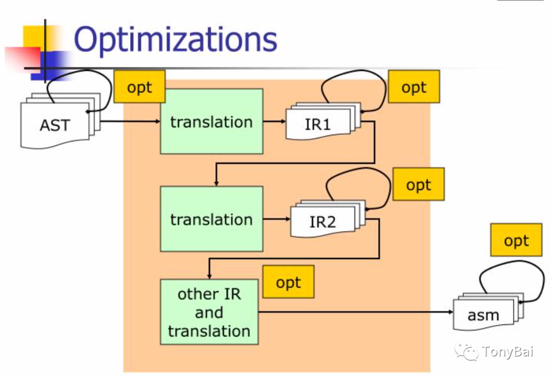 注:现代编程语言编译过程多数会多次生成中间代码(IR),比如下面要提到的静态单赋值形式(SSA)也是一种IR形式。针对每种IR,编译器都会有一些优化动作: