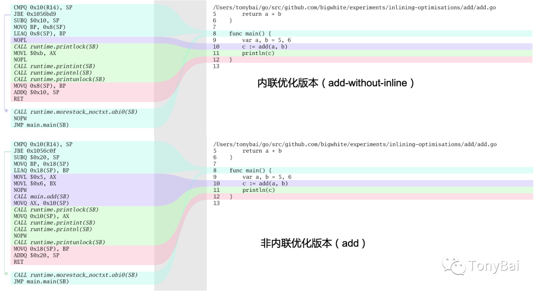 这个例子中,我们的关注点是add函数,在add函数定义上方,我们用//go:noinline告知编译器对add函数关闭inline,我们构建该程序,得到可执行文件:add-without-inline;然后去掉//go:noinline这一行,再进行一次程序构建,得到可执行文件add,我们用lensm工具[6]以图形化的方式查看一下这两个可执行文件的汇编代码,并做以下对比: