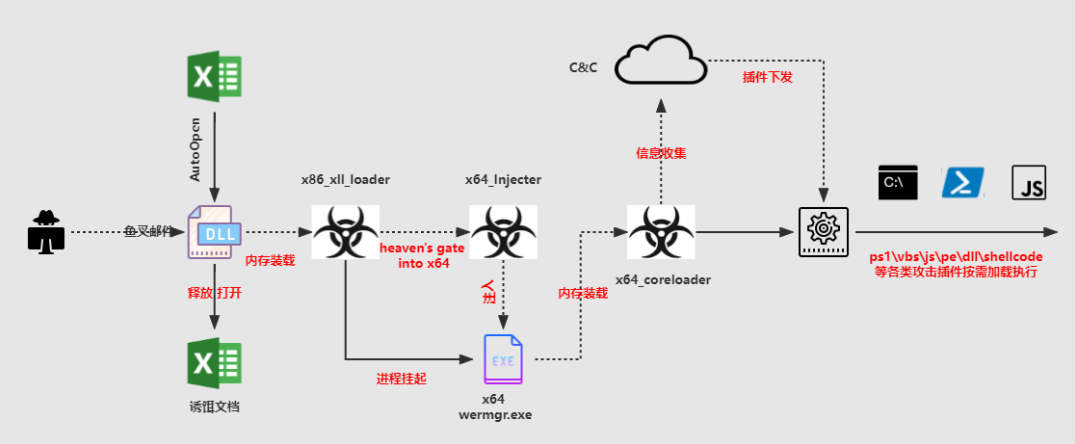2. 原始攻击样本均为xll文件类型(Excel扩展插件),且针对攻击目标主机环境为装有32位office excel的64位Windows操作系统。核心载荷为内存C++ JssLoader木马。