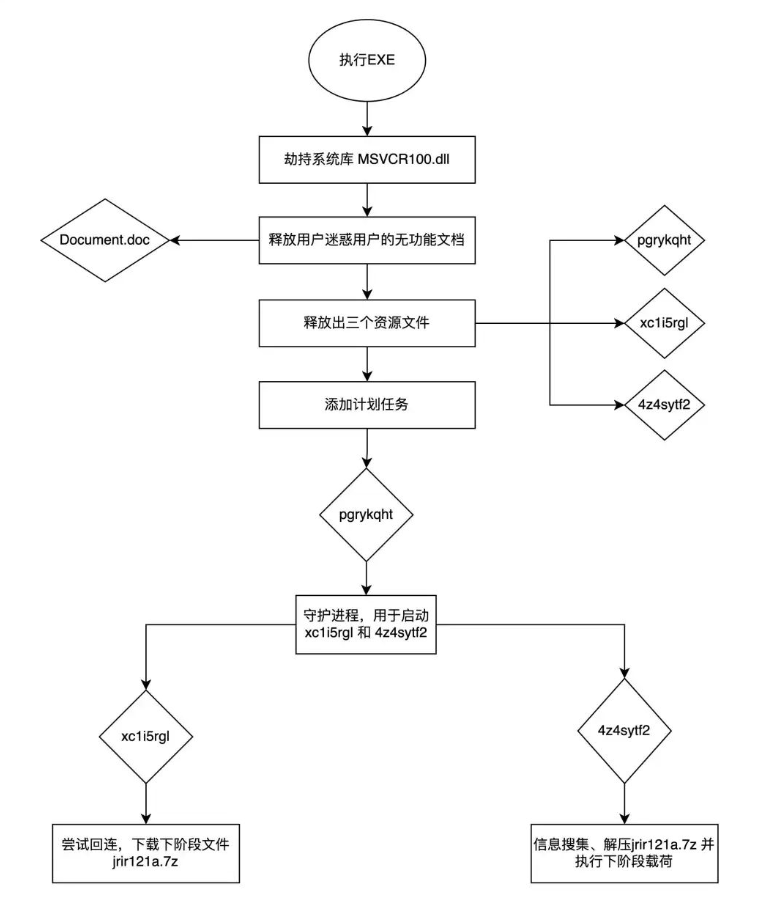 近日,研究人员捕获到了“海莲花”的攻击活动样本。当用户打开WINWORD.EXE时,会加载恶意文件(MSVCR100.dll),该恶意文件会释放3个文件,分别执行持久化、下载下一阶段后门和信息收集并回传,该样本采用白+黑的方式实现防御规避,通过创建计划任务实现持久化。此外,样本会通过不透明谓词、花指令等方案对抗静态分析。