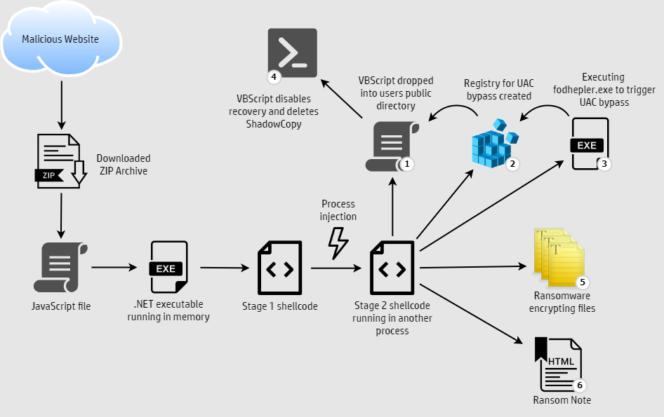 感染链从攻击者网站的网络下载开始。网站要求用户下载包含JavaScript文件的ZIP文件,该文件声称是重要的防病毒或Windows 10软件更新。Magniber恶意软件会枚举文件并根据列表检查其文件扩展名。最后,恶意软件在每个目录中释放一个带有加密文件的赎金记录,并通过在网络浏览器中打开该记录将其显示给受害者。
