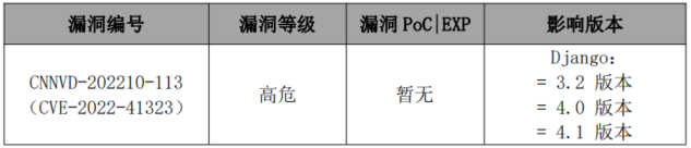 近日,嘉诚安全监测到CNNVD官方发布了Django 拒绝服务漏洞的安全风险通告,漏洞编号为:CNNVD-202210-113(CVE-2022-41323)。