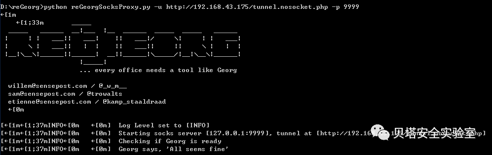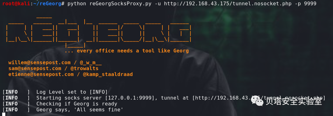 前面介绍了windows系统环境下使用Proxifier作为客户端,进行内网渗透,接下来将给大家介绍linux系统环境下使用proxychains作为客户端,对内网进行渗透测试。reGeorg的使用方式与6.1.1节相同,此处对reGeorg使用不进行详细介绍。在linux系统下对目标配置好reGeorg代理,执行过程如下所示:python reGeorgSocksProxy.py -u http://192.168.43.175/tunnel.nosocket.php -p 9999