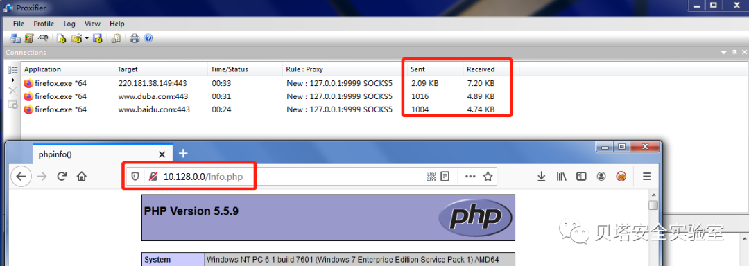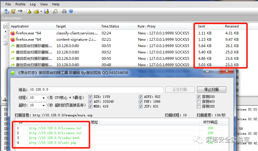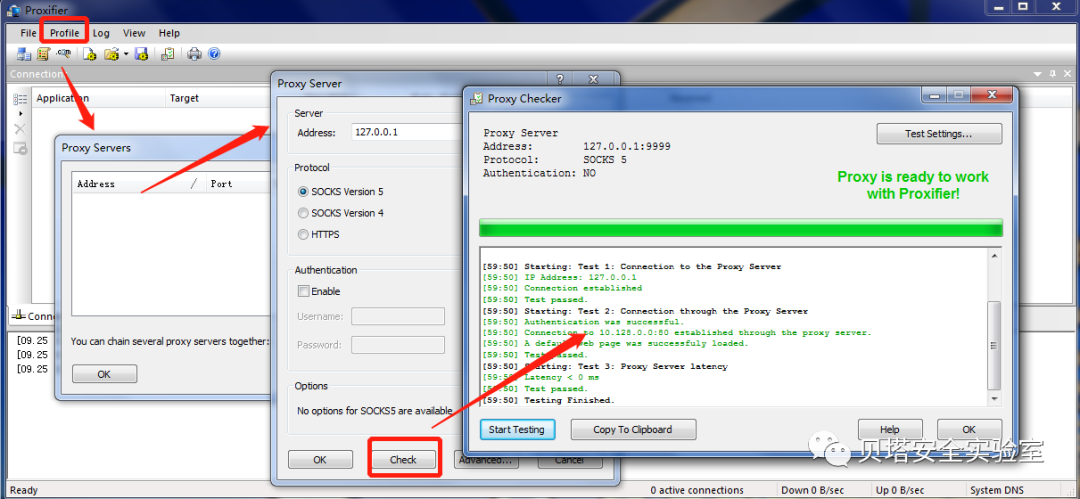 通过浏览器插件foxyProxy工具配置socket5代理访问内网:当使用没有代理功能的工具对目标内网进行渗透时,可以使用Proxifier工具能够将程序通过socks代理对内网进行渗透。详细的使用过程如下所示:打开Proxifier软件,单击Profile->Proxy Server->add添加本地主机的代理端口。协议选择socks5类型,可以点击check进行测试当前代理是否成功。接下来,可以通过proxification Rules添加规则,此处添加firfox可执行文件,添加完成以后该工具的通讯流量会经过socks5代理工具进行传输,执行结果如下所示,可以通过firefox访问目标网站。也可以通过proxification添加规则,添加御剑后台扫描工具,对目标网站目录进行爆力破。注:reGeorg代理工具中的tunnel.nosocket.php脚本适用于php5.4< tunnel.nosocket.php< php7的环境1.2 reGeorg+proxychains代理工具