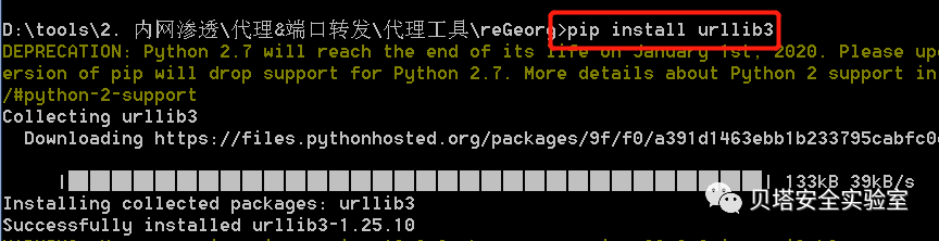 下面将以php类型的网站环境为例给大家介绍如何通过reGeorg+Proxifier工具搭建代理,进行内网渗透。根据链接下载reGeorg代理工具,reGeorg代理工具是以python2为基础进行开发的,使用前需保证自己本地安装python2版本的环境并安装工具所需的urllib3库函数,详细安装过程如下图所示:根据当前目标网站可解析语言类型,选择所需上传的代理工具脚本,reGeorg代理工具包含PHP|JSP|ASPX|ASHX等语言,该实验以PHP文件为例给大家进行介绍。当我们通过浏览器访问上传的tunnel.nosocket.php文件时,当页面显示出Georg says, 'All seems fine’表示代理工具能够正常解析运行。在攻击机上使用 python2运行 reGeorgSocksProxy.py脚本配置代理,当程序执行结果显示“Georg says, ‘All seems fine’”表示该代理工具能够正常执行。python reGeorgSocksProxy.py -u http://ip/tunnel.nosocket.php -p 9999