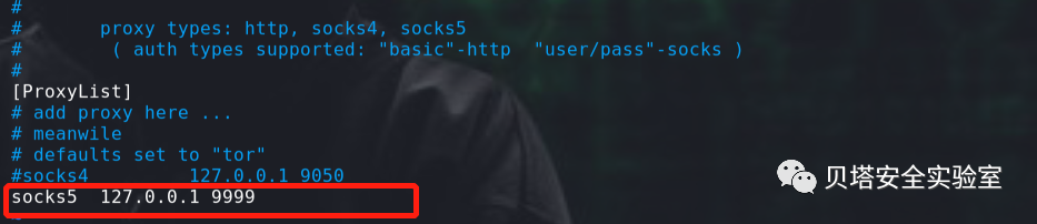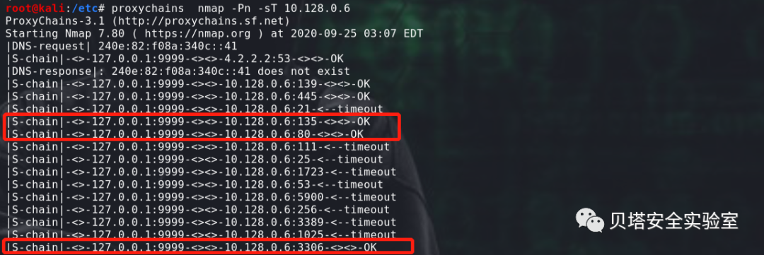 在建立好reGeorg代理工具以后,需要配置proxychains.conf文件,在文件最后添加“socks5 127.0.0.1 9999”,如下图所示:通过reGeorg代理工具,对目标内网主机进行端口扫描,具体执行过程如下图所示:proxychains nmap-sT-Pn 10.128.0.6