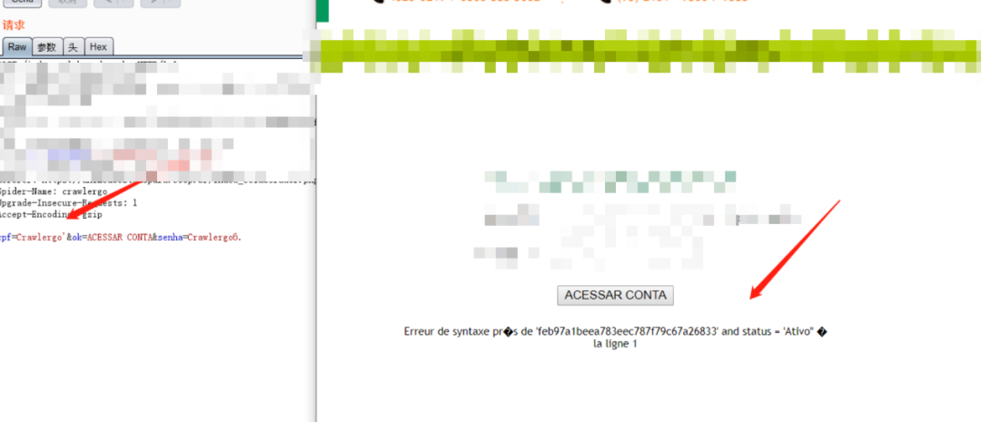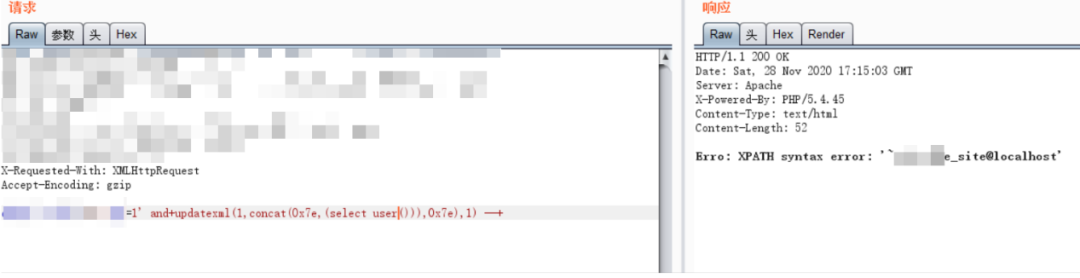第二个存在有注入点的网站如下,是一个登陆框的注入点,抓包对其进行注入点测试,这里直接就报错了!这里显示报错说明可以是可以报错注入来获取信息!![]()