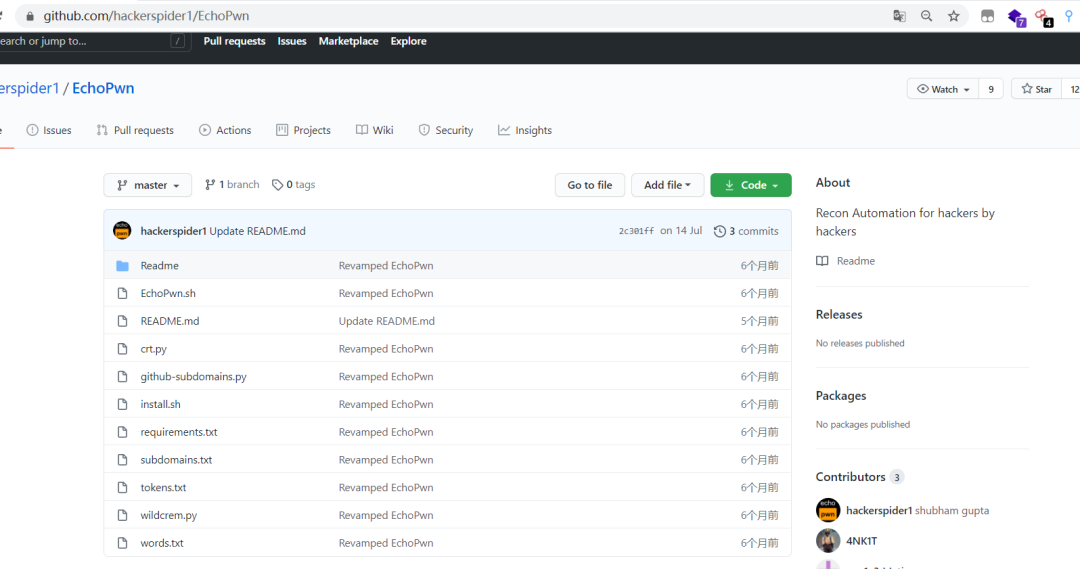 这里我后来又学习了一个自动化信息收集工具!其实它的原理很简单,这个工具主要就是shell脚本,把多个信息收集工具放入到目录下面,通过shell脚本自动收集子域名等信息然后再通过去重等操作完成收集任务!![]()