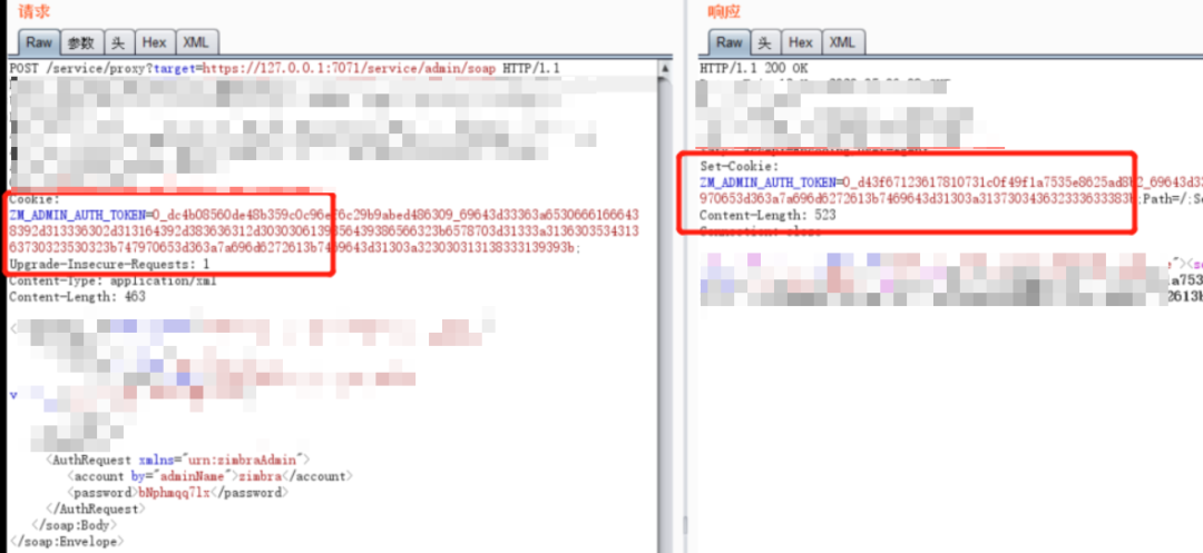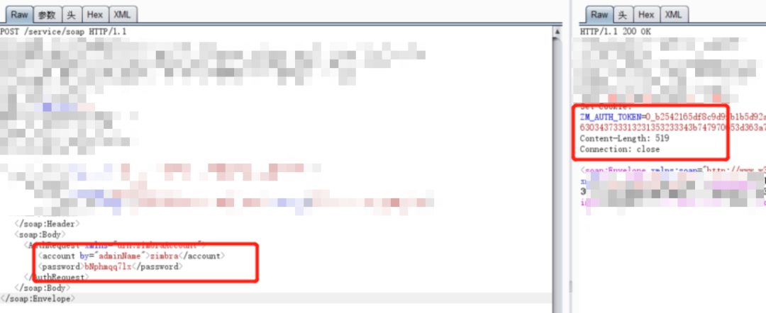 利用已经得到的密码获取低权限的token,低权限的token可以通过soap接口发送AuthRequest进行获取。访问到 /service/soap 或/service/admin/soap 接着进行 抓包并且修改为POST模式。还要修改Content-Type: application/xml 。![]()