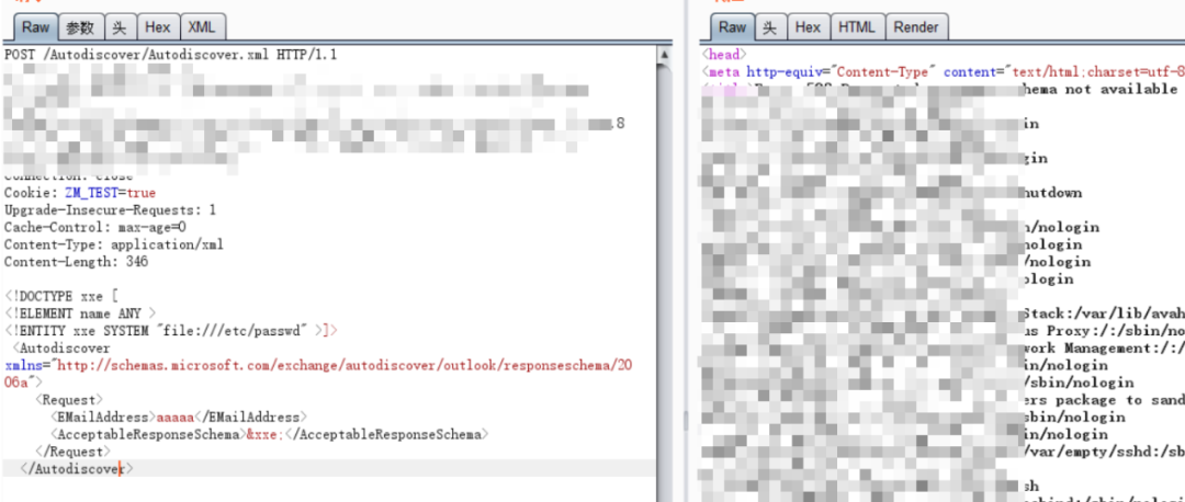 这里已经成功的读取到了用户的信息。说明XXE攻击成功了!接着需要构造payload来读取zimbra的配文件localconfig.xml。由于localconfig.xml为XML文件,需要加上CDATA标签才能作为文本读取,由于XXE不能内部实体进行拼接,所以此处需要使用外部dtd。![]()