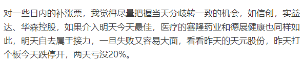 尽量把握一些日内主动领涨的又带有分歧的票,而少做些大涨后的加速接力,尤其是连续大涨后的接力。