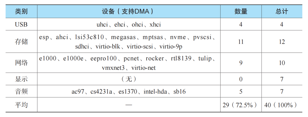 为了证明DMA在虚拟机管理器虚拟设备中的广泛使用,我们对QEMU中支持DMA通信的设备百分比进行了统计分析。我们选择了虚拟化场景中最常见的5种QEMU设备类型(不包括某些杂项设备和后端设备)。我们手动分析设备中是否存在DMA传输机制。分析结果如表1所示,其中72.5%的设备支持DMA。除显示设备以外,几乎所有设备都必须使用DMA来传输复杂的数据结构(尤其是涉及存储和网络的设备)。由此可见,DMA在虚拟机管理器中得到了广泛地使用,这就要求我们在虚拟机管理器中应用模糊测试时更加关注与DMA相关的代码。