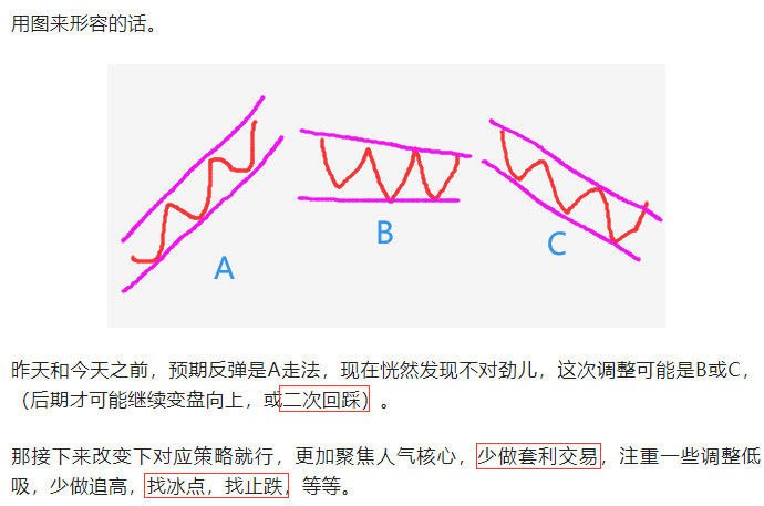 并且当时我还画了图,如果市场强,应该如何走,如果市场弱,又会如何走,结果当时指数并没有反弹回到五日线上,而是跌破五日线调整了。