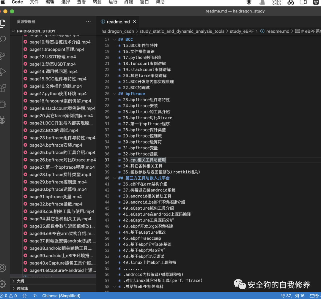 # eBPF系统视频教程## 基础教程* 1.课程介绍* 2.eBPF介绍* 3.eBPF工作机制(组成)* 4.BCC工具集源码编译* 5.编译安装内核源码* 6.第一个eBPF程序* 7.动态插桩技术介绍* 8.kprobes原理* 9.uprobes原理* 10.静态插桩技术介绍* 11.tracepoint原理* 12.USDT原理* 13.动态USDT* 14.调用栈回溯## BCC* 15.BCC组件与特性* 16.文件操作追踪* 17.python使用环境* 18.funcount案例讲解* 19.stackcount案例讲解* 20.其它tarce案例讲解* 21.BCC开发与内部实现原理* 22.BCC的调试## bpftrace* 23.bpftrace组件与特性* 24.bpftrace安装* 25.bpftrace的工具介绍* 26.bpftrace对比Dtrace* 27.第一个bpftrace程序* 28.bpftrace探针类型* 29.bpftrace控制流* 30.bpftrace运算符* 31.bpftrace变量* 32.bpftrace函数* 33.cpu相关工具与使用* 34.其它各种相关工具* 35.函数参数与返回值修改(rootkit相关)## 第三方工具与嵌入式平台* 36.eBPF在arm架构介绍* 37.树莓派安装android系统* 38.android相关辅助工具* 39.android上eBPF环境搭建介绍* 40.eCapture抓包工具介绍* 41.eCapture在android上源码编译* 42.eCapture工具源码分析* 43.ebpf开发之go环境搭建* 44.基于eCapture魔改* 45.ebpf与seccomp* 46.基于ebpf分析apk基础* 47.基于ebpf对so分析* 48.基于ebpf过反调试* 49.linux上的ebpf工具移植* ........* .android内核编译(树莓派移植)* .对比linux其它分析工具(perf、ftrace)* .总结与eBPF相关资料