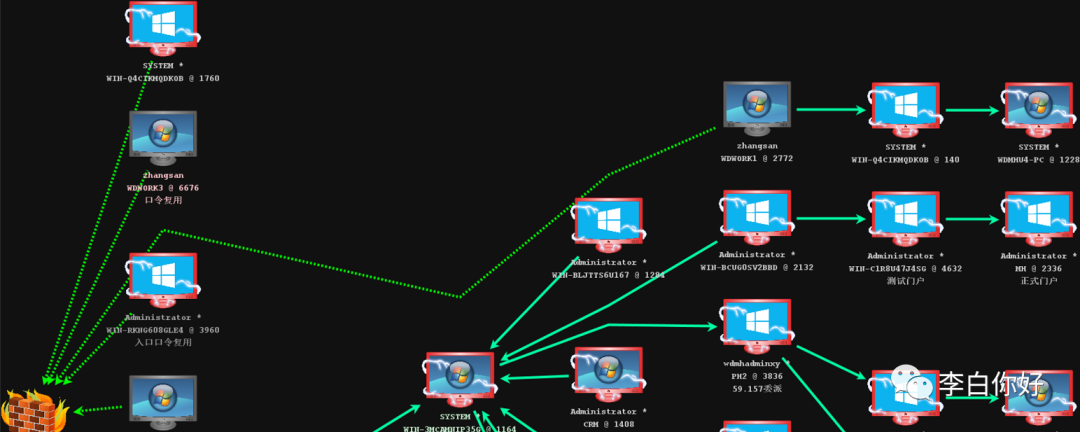 上线至CS之后,抓取明文密码和Hash,但没有发现其余用户账号和hash,只能使用Administrator账号和hash,psexec尝试批量上线其余机器,因为是Administrator用户,工作组情况下也可以的。