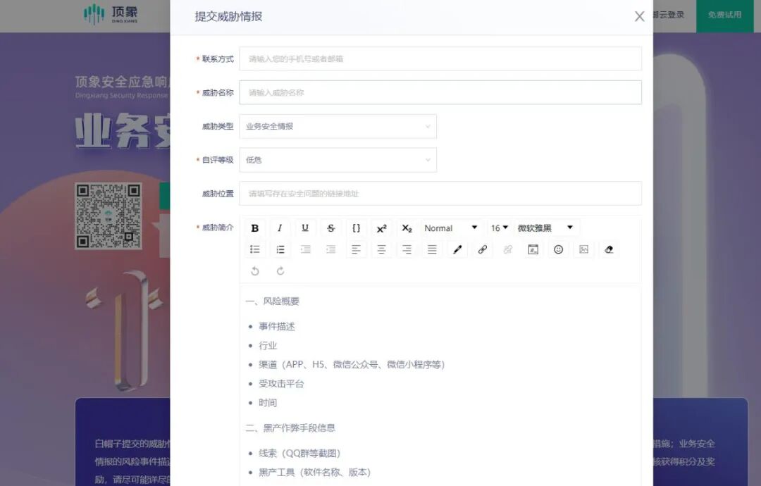 威胁情报提交包括风险概要、黑产作弊手段以及黑产变现链路。