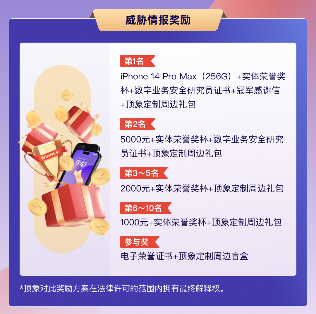 注:参赛者提交的威胁情报内容包括但不限于:漏洞的位置及潜在危害,复现该漏洞所需的步骤、脚本、重现该问题的技术相关信息、可能的解决措施;风险事件描述、黑灰产作弊手段信息及变现链路等。