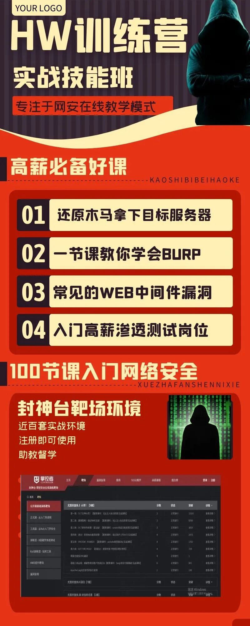 2)对于初入行的网安从业者,想要提升自身的渗透技术的朋友来说,这门课程当中的实操训练对于你来说是不可或缺的部分。