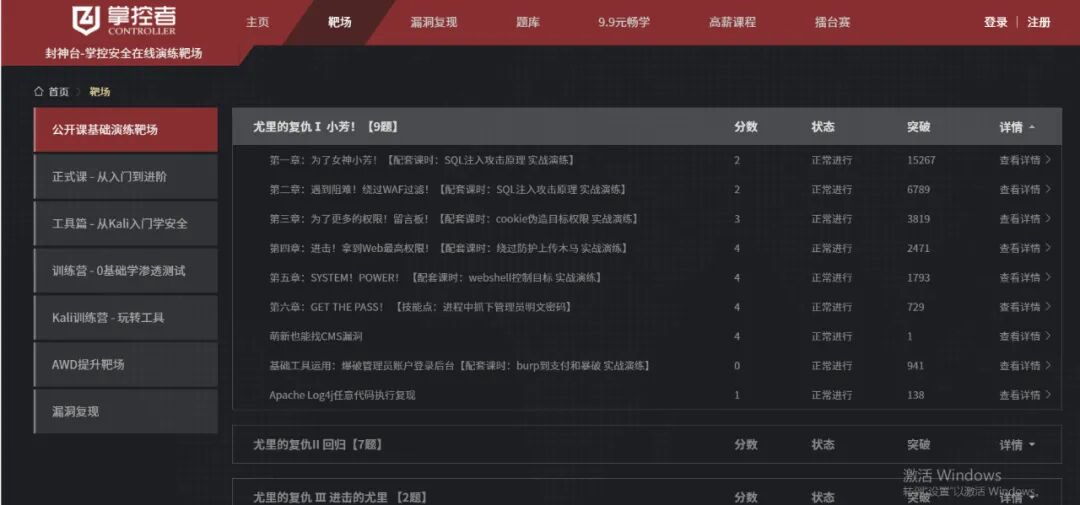 光说不练假把式!寻找一些靶场进行实战训练,对于新手不建议进行CTF、SRC的训练。可以选择一些好的教育平台学习,它们会提供实战靶场。