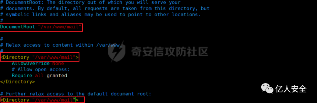 更改配置文件/etc/httpd/conf/httpd.conf,这里修改/var/www/mail为根目录,也可以使用默认配置