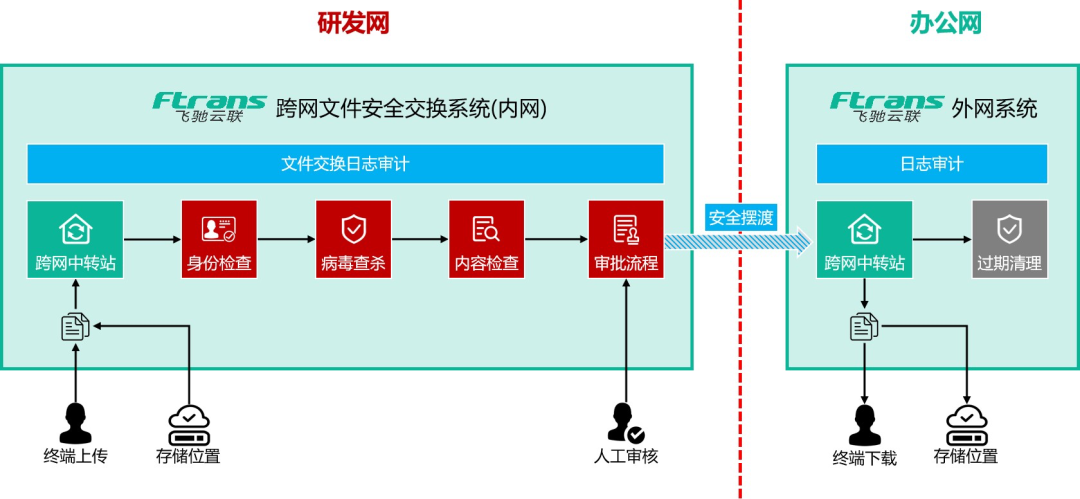 最终小张公司找到了 Ftrans 飞驰云联的《Ftrans Ferry 跨网文件安全交换系统》,这些问题都完美解决了!