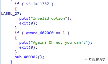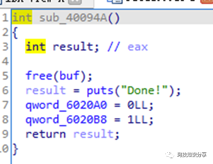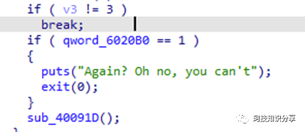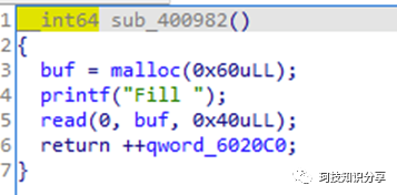 当v3!=3时break,也就是v3=3(Show),且qword_6020B0不为1时进入sub_40091D()。在里面打印buf(指向我们的chunk)并将qword_6020B0置1。