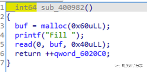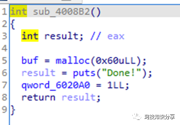 sub_4008B2中有明显的malloc(),开辟了一块0x60的chunk,并将qword_6020A0置1,那么很明显,我们只有一块chunk。
