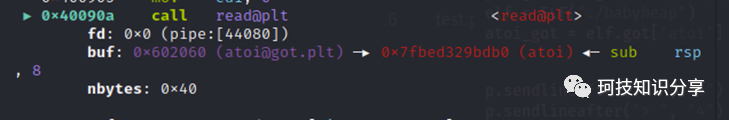 然后又该怎么利用呢?别忘了bss段存储的buf指针被我们编辑成了atoi的got表,用Show会泄露其真实地址,用Edit就会编辑got表。此时编辑成system的真实地址,就等于劫持了got表。在Edit的read()处下断点可以看到。