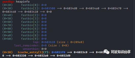 fd/bk分别指向tcache/fastbin中的前一个chunk/后一个chunk,不过这里调试只有fd而且是0x00。我们用备份的babyheap2(libc-2.33.so)调试结果如下。