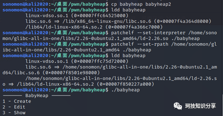 cp babyheap babyheap2ldd babyheappatchelf --set-interpreter /home/sonomon/glibc-all-in-one/libs/2.26-0ubuntu2.1_amd64/ld-2.26.so ./babyheappatchelf --set-rpath /home/sonomon/glibc-all-in-one/libs/2.26-0ubuntu2.1_amd64 ./babyheapldd babyheap./babyheap