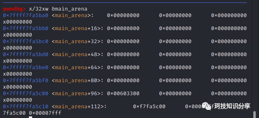 其中top chunk为预置,我们还可以用堆管理器main_arena查看。