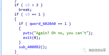 看反编译代码,v3=1(Create)时,先检测qword_6020A0,过了就会执行sub_4008B2()。