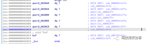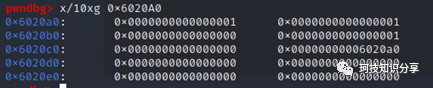 这里存储着qword_6020A0等计数器,以及buf的指针。我们先尝试修改计数器,通过之前的代码分析可知,只有Delete会重置Create的计数器,也就是说Create可使用两次,Edit/Show/Delete/Fill都只能使用一次。